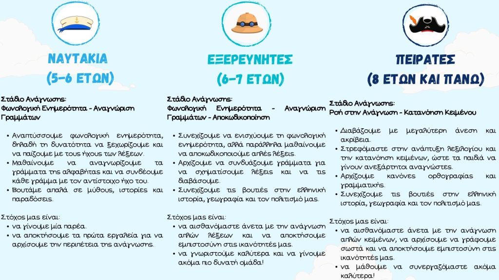 Υπάρχουν σε αυτόν τον κύκλο 3 επίπεδα, τα Ναυτάκια, οι Εξερευνητές και οι Πειρατές.